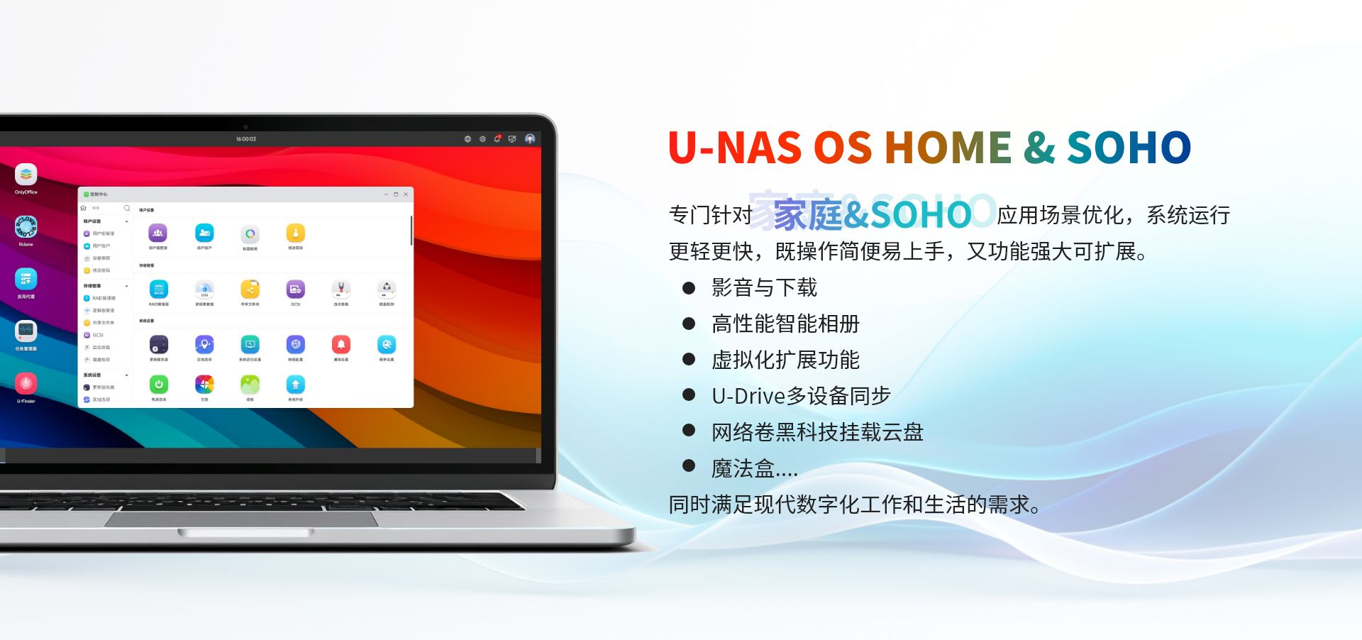 基于萬由U-NAS OS 體系的存儲(chǔ)、備份、私有云服務(wù)的一體化平臺(tái),為企業(yè)提供一套安全、高性能、彈性可擴(kuò)展的一體化數(shù)據(jù)統(tǒng)一管理、主動(dòng)備份和數(shù)據(jù)在不同地區(qū)、不同設(shè)備同步的解決方案。并提供個(gè)性化的定制服務(wù),使企業(yè)的TOC(總體擁有成本)最低